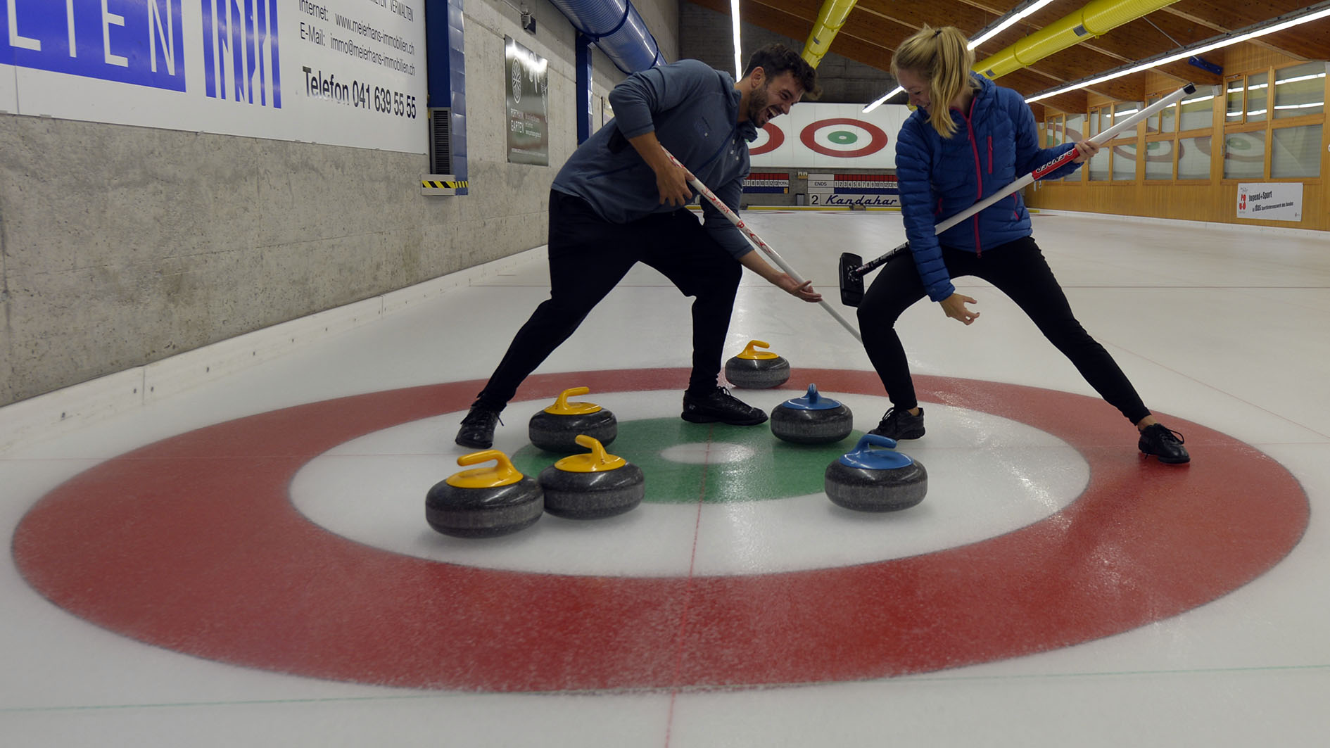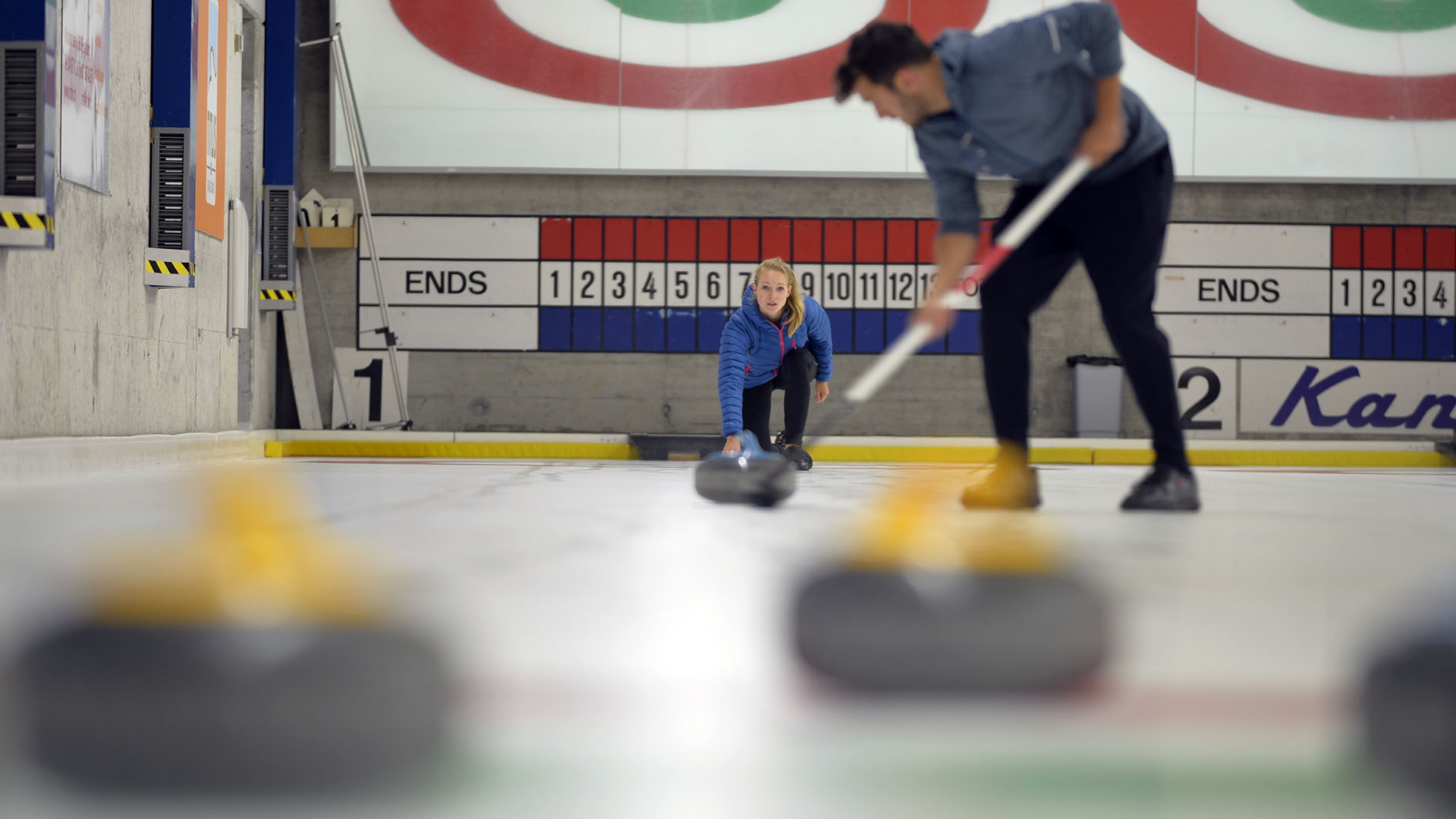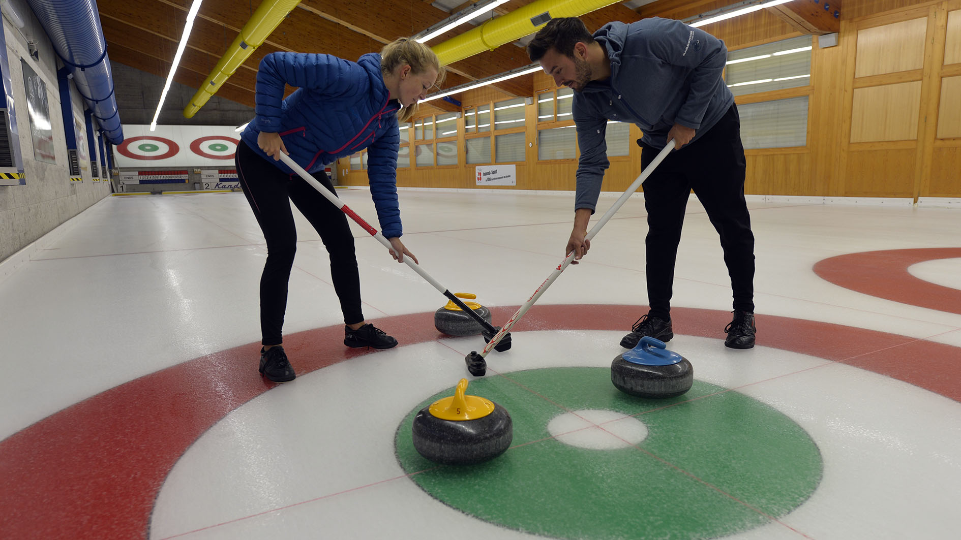 Während zwei Stunden werden Sie durch einen Instruktor in die Geheimnisse und Fertigkeiten des Curlingsports eingeführt – weitere Informationen dazu unter Curling-Plausch.